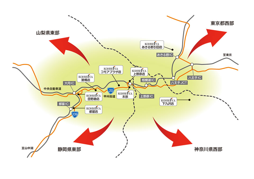 お取引様とのさらなる取り組みのためにも、山梨東部を中心に東京西部・神奈川西部・静岡東部でのドミナントを維持した出店戦略を採っていきます。